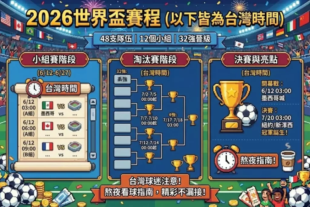 2026世界盃足球賽這裡整理成為各組別的第一輪賽事,這樣大家比較好了解各賽事時間,同時小編也把這份賽程整理成為台灣時間,大家不需要再換時間去觀看,基本上2026世界盃足球賽時間都是半夜以及清晨開踢,畢竟都是在歐美國家進行賽事,所以要看即時轉播只能熬夜了。