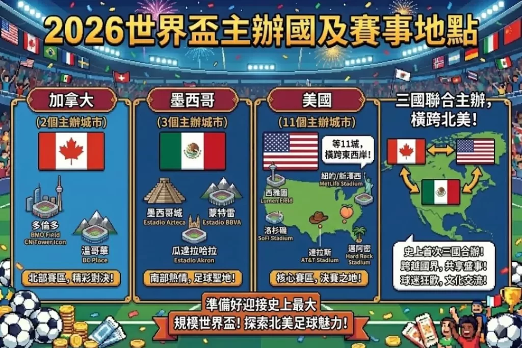 2026世界盃足球賽這次有三個國家共同舉辦,分別是美國、加拿大以及墨西哥,這意味著三國直接進入小組賽,當然這次賽事也會橫跨三個國家舉辦,成為世界盃首次三個國家共同舉辦的賽事,當然主要還是美國賽事場地為主,橫跨歐洲的足球盛會將打開足球的元年!