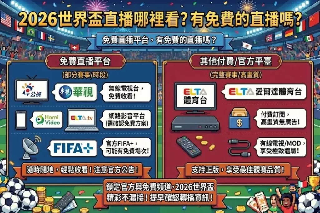 2026世界盃直播只剩下愛爾達?又是愛爾達?想必大家都已經不爽愛爾達很久了,就算今天你購買五大聯賽的轉播,但是遇到世界盃就是需要重新付費,這一點是愛爾達的通病,所以如果想要看免費的世界盃轉播平台,不妨看看以下小編推薦的2026世界盃直播平台。